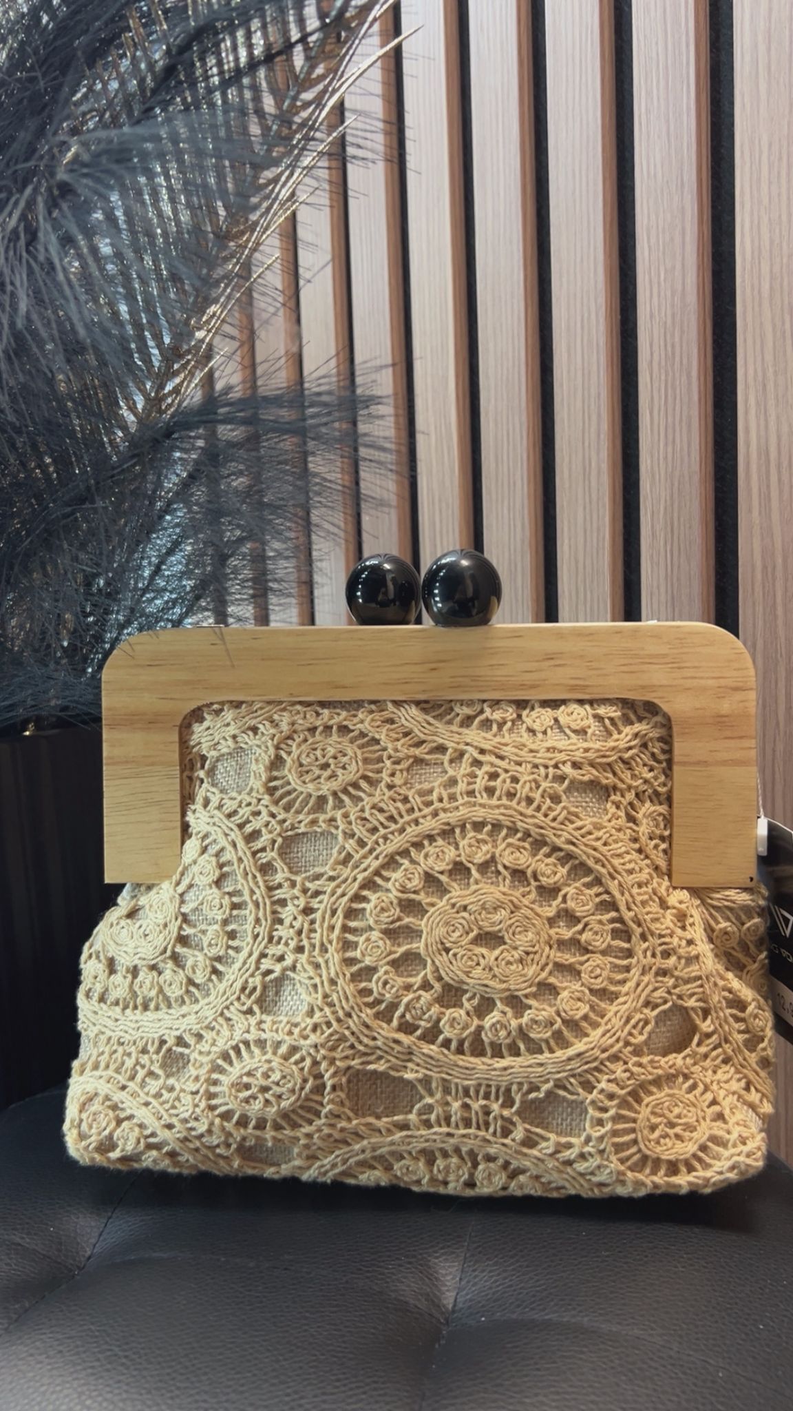 Bolso de mano estilo artesanal con encaje beige y marco de madera, elegante y perfecto para un look natural y sofisticado 🤍👜✨