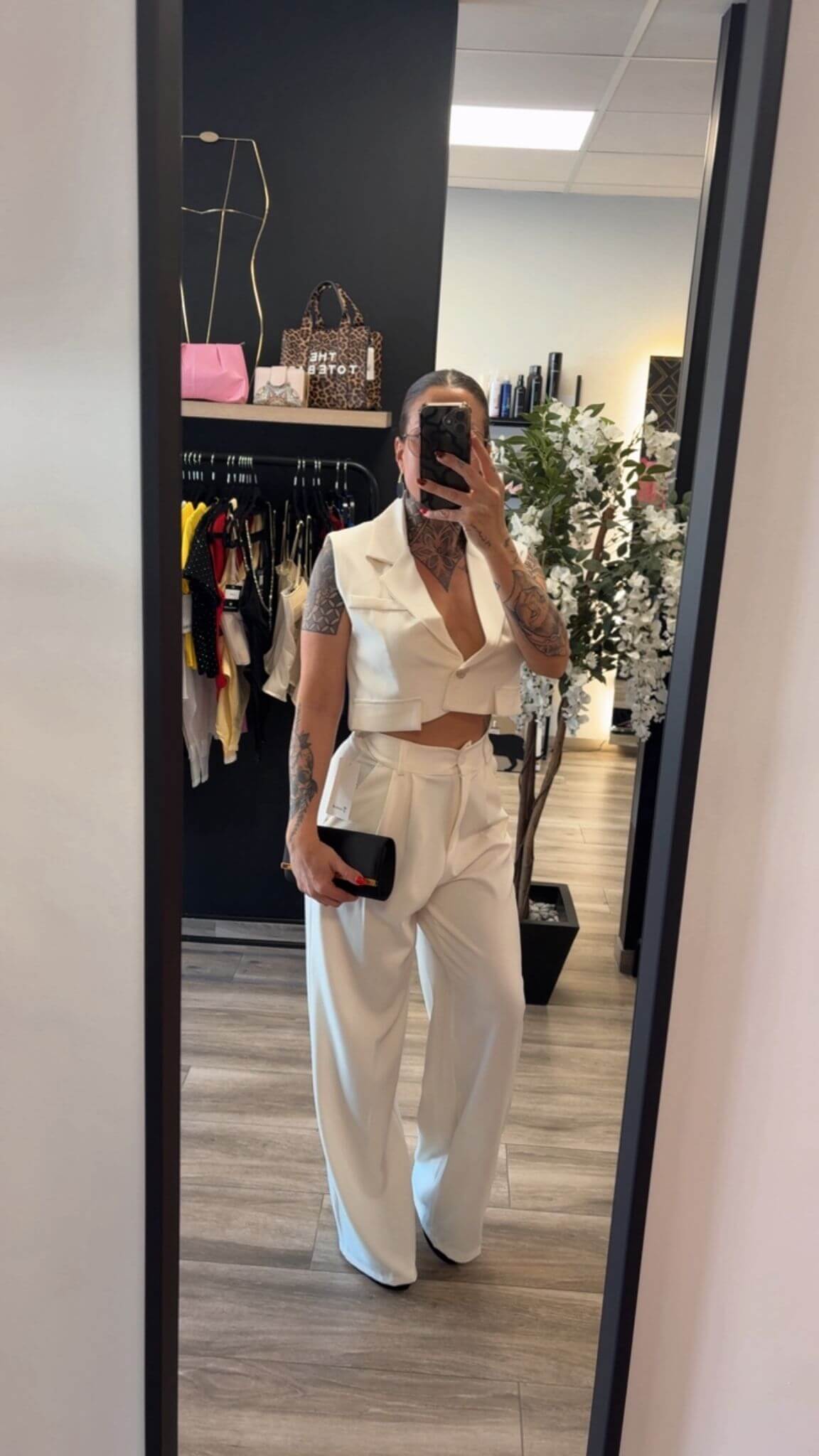 Chaleco corto con escote marcado y pantalón de corte amplio que estiliza y aporta movimiento al look.