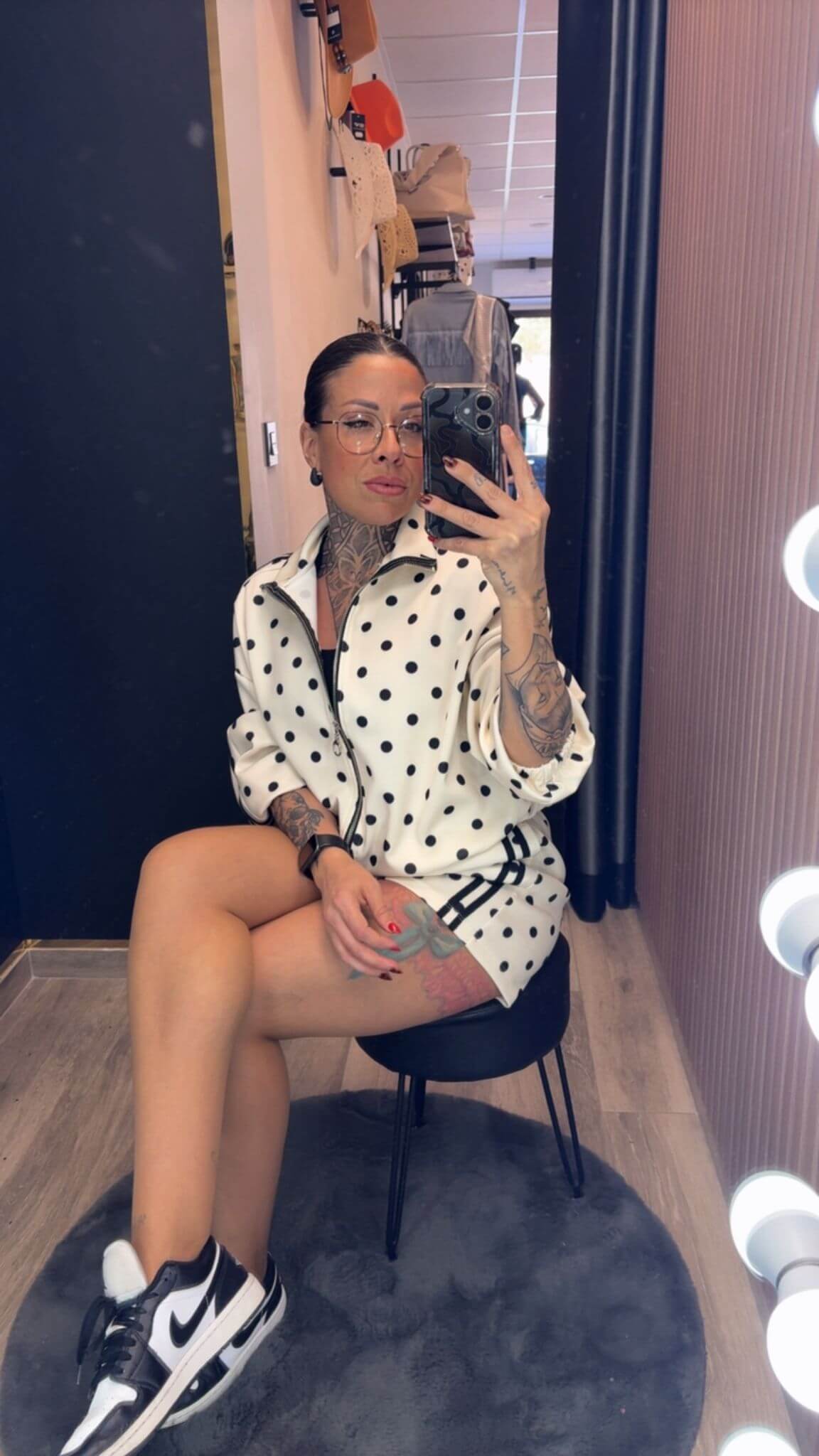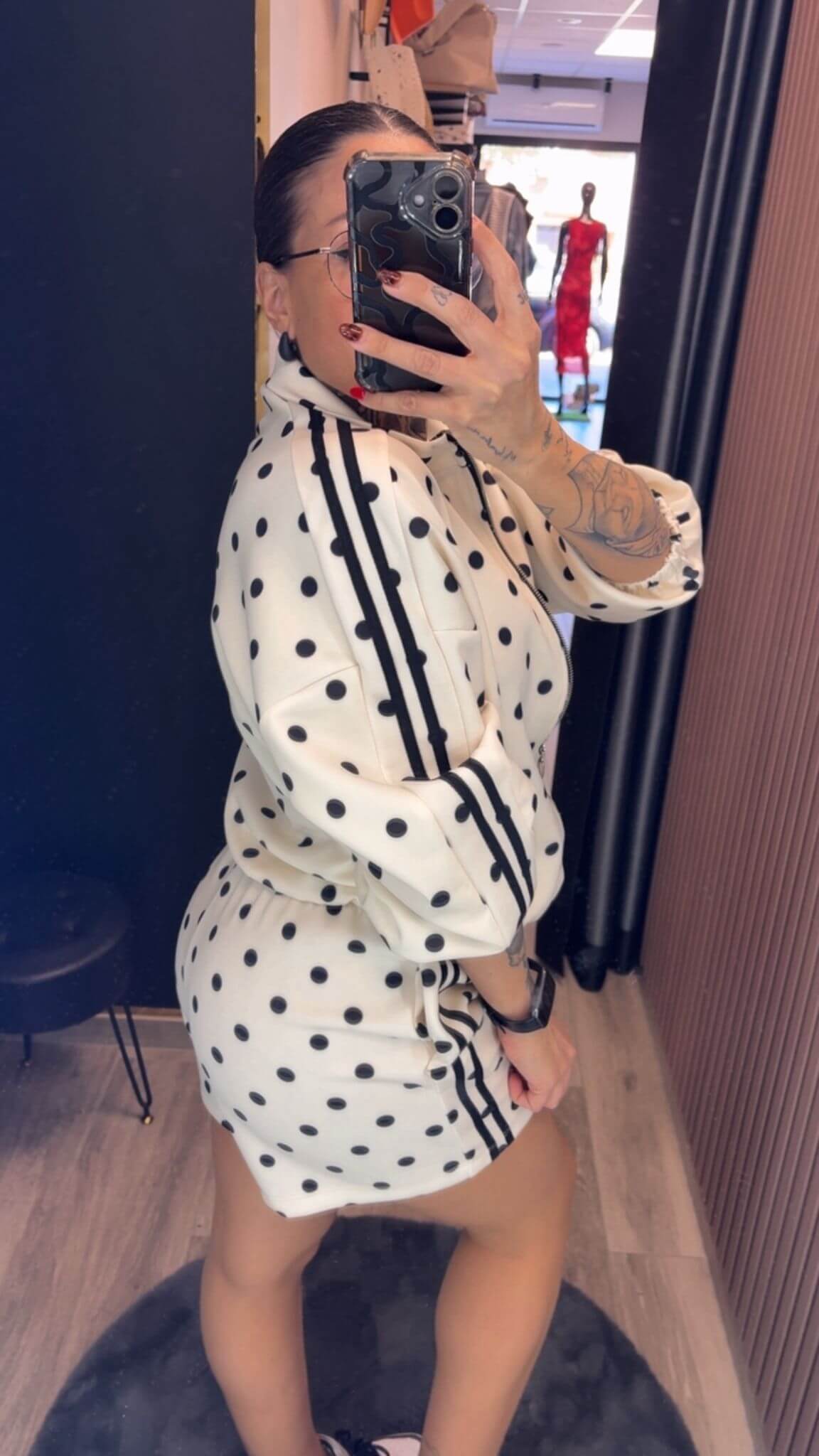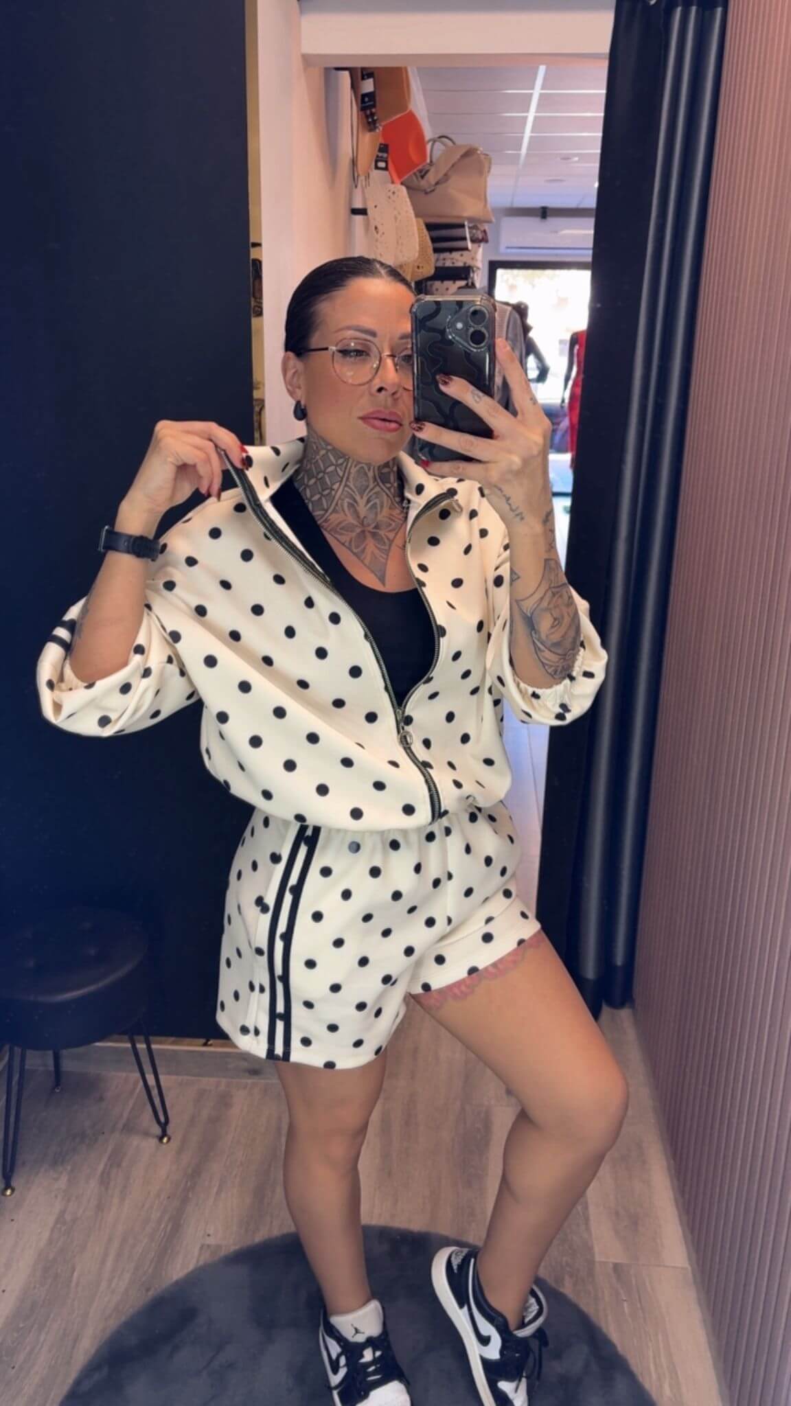 Conjunto de dos piezas con estampado de lunares que mezcla comodidad y estilo con un aire urbano muy actual. La chaqueta con cremallera y cuello subido aporta un toque desenfadado y moderno, mientras que el short de tiro medio con cintura elástica se adapta al cuerpo y estiliza sin apretar.