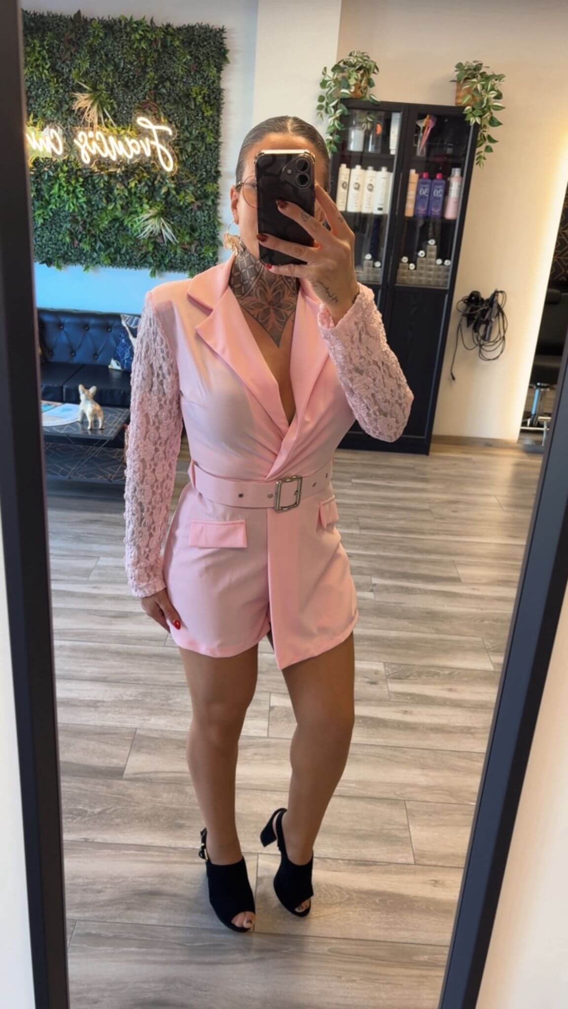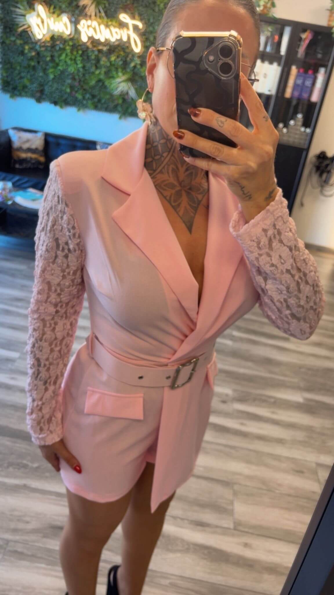 Sofisticado mono tipo blazer en tono rosa 💗, con diseño estructurado que estiliza la figura. Destaca por sus mangas de encaje delicado 🌸 y cinturón ajustable que realza la cintura ✨. Ideal para ocasiones especiales o looks elegantes con un toque moderno y femenino 💫.