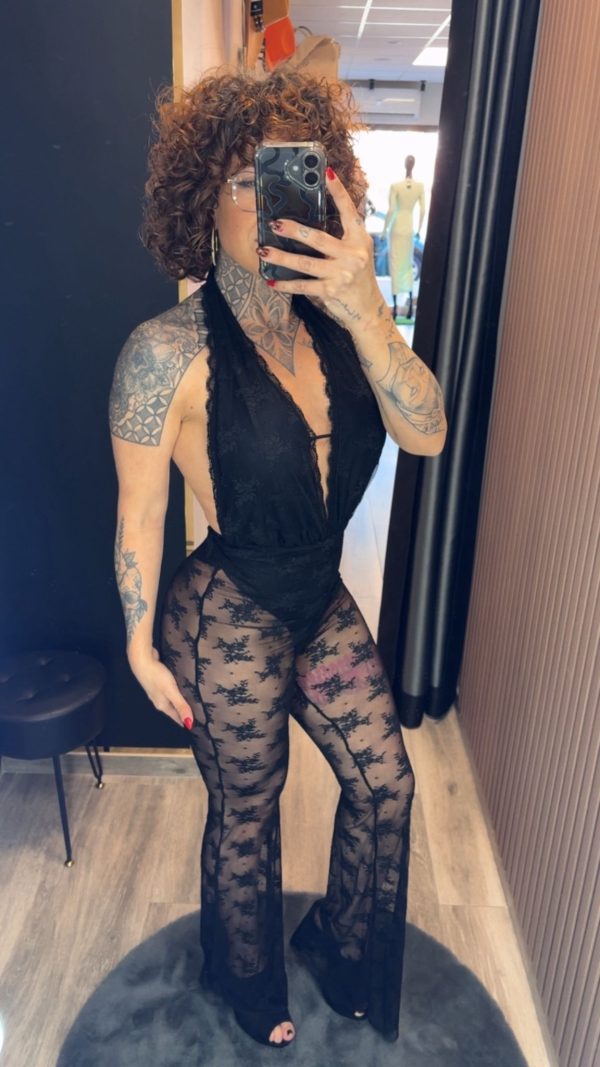 La parte inferior en encaje semitransparente añade un aire sofisticado y sensual, mientras que el corte acampanado en las piernas alarga visualmente la silueta y aporta movimiento al conjunto.