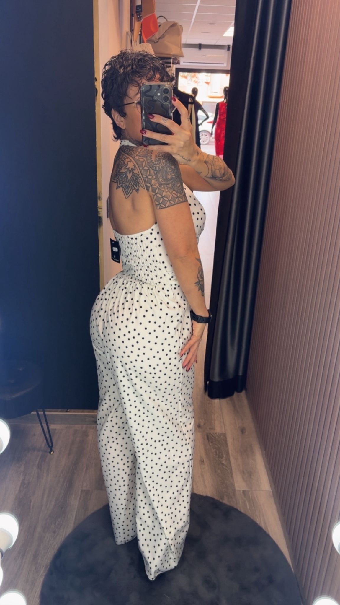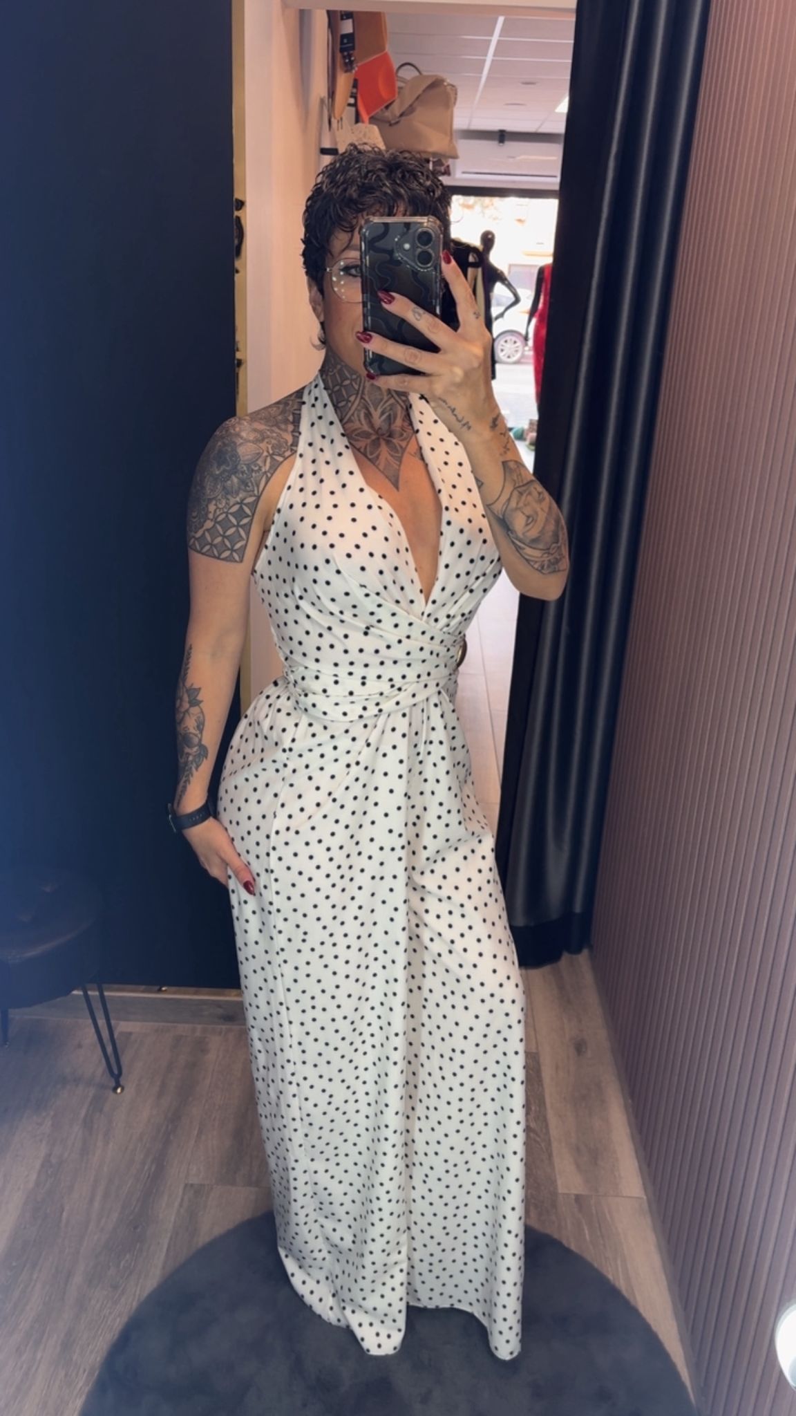 Mono largo en color blanco con estampado de lunares negros, de estilo fresco y femenino. Presenta escote halter pronunciado y cintura entallada que realza la silueta, con pernera amplia que aporta movimiento y elegancia. Ideal para looks de verano con un toque retro y sofisticado.