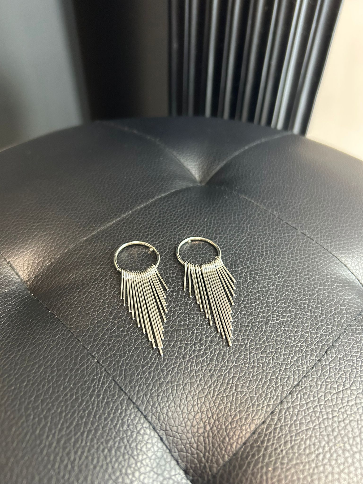 Aretes plateados con diseño de aro y delicadas tiras colgantes que crean un efecto moderno y elegante. Perfectos para añadir movimiento y un toque sofisticado a cualquier look. ✨