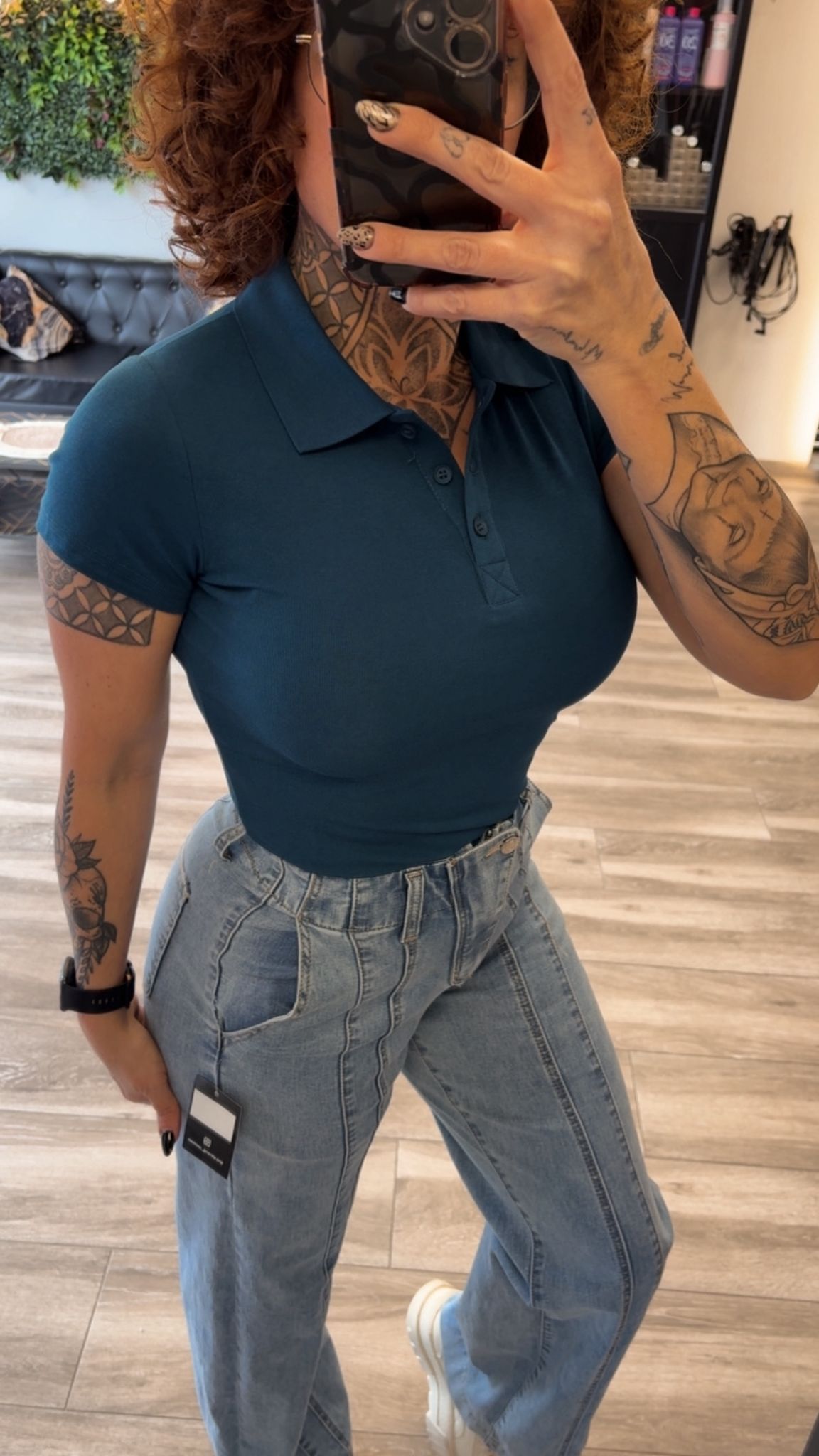 Polo ajustado en color azul petróleo de manga corta con cuello clásico y botones frontales. Tejido elástico y cómodo que se adapta al cuerpo, ideal para un look casual y favorecedor. ✨