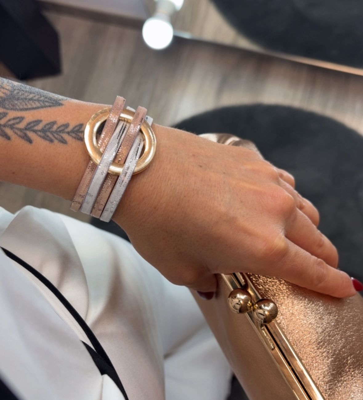 Pulsera de estilo moderno compuesta por varias tiras finas en tonos metálicos combinados (plateado, dorado y rosado), con acabado texturizado. Destaca su pieza central de aros entrelazados en dorado, que aporta un toque elegante y sofisticado. Flexible y llamativa, ideal para elevar cualquier look.