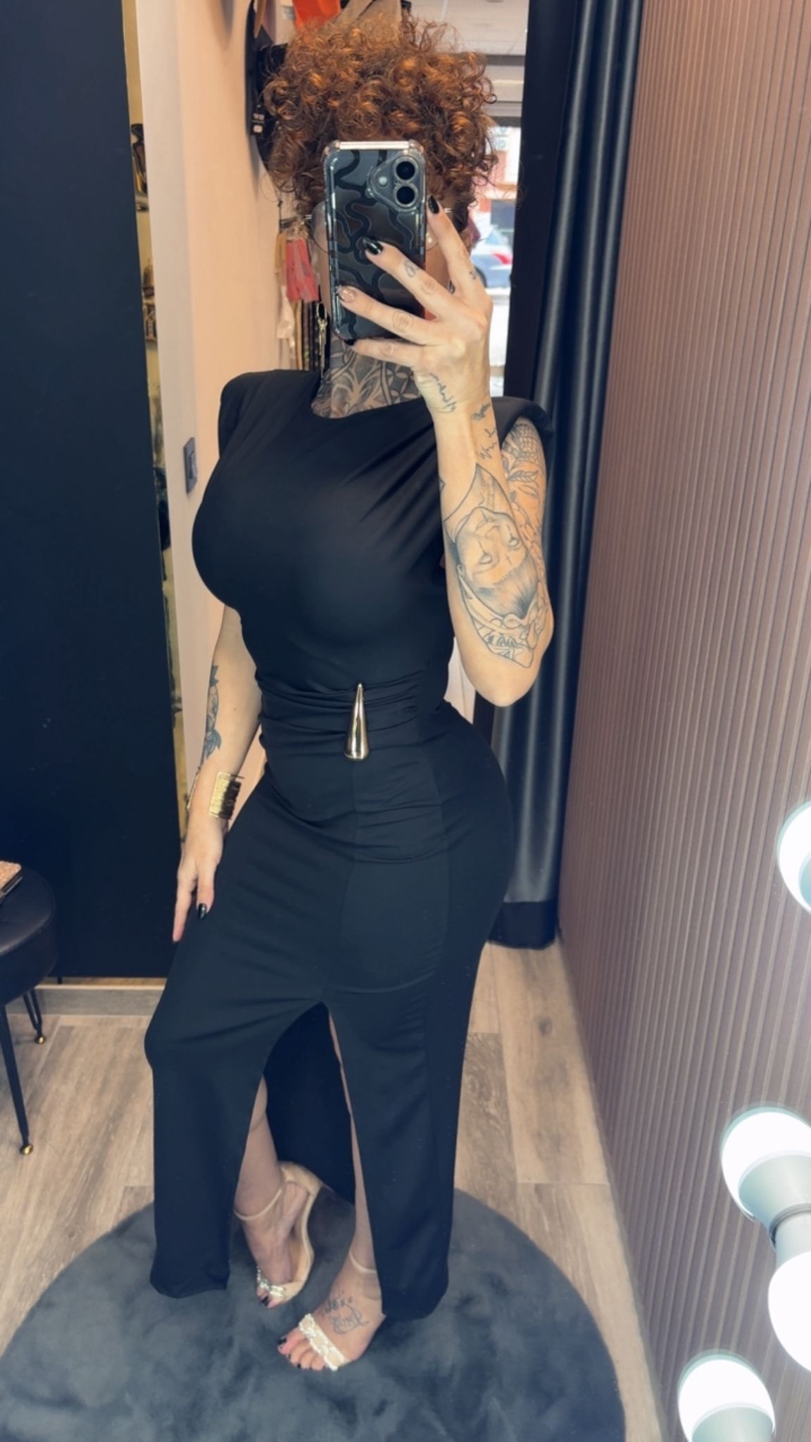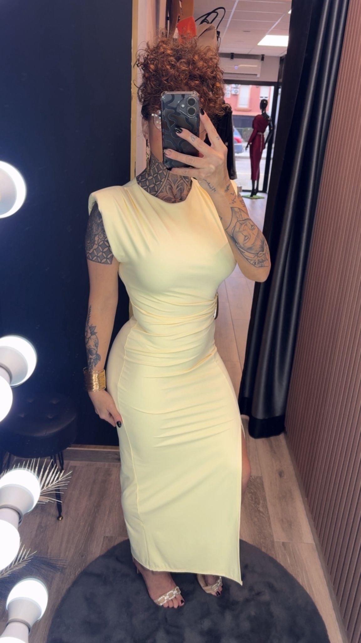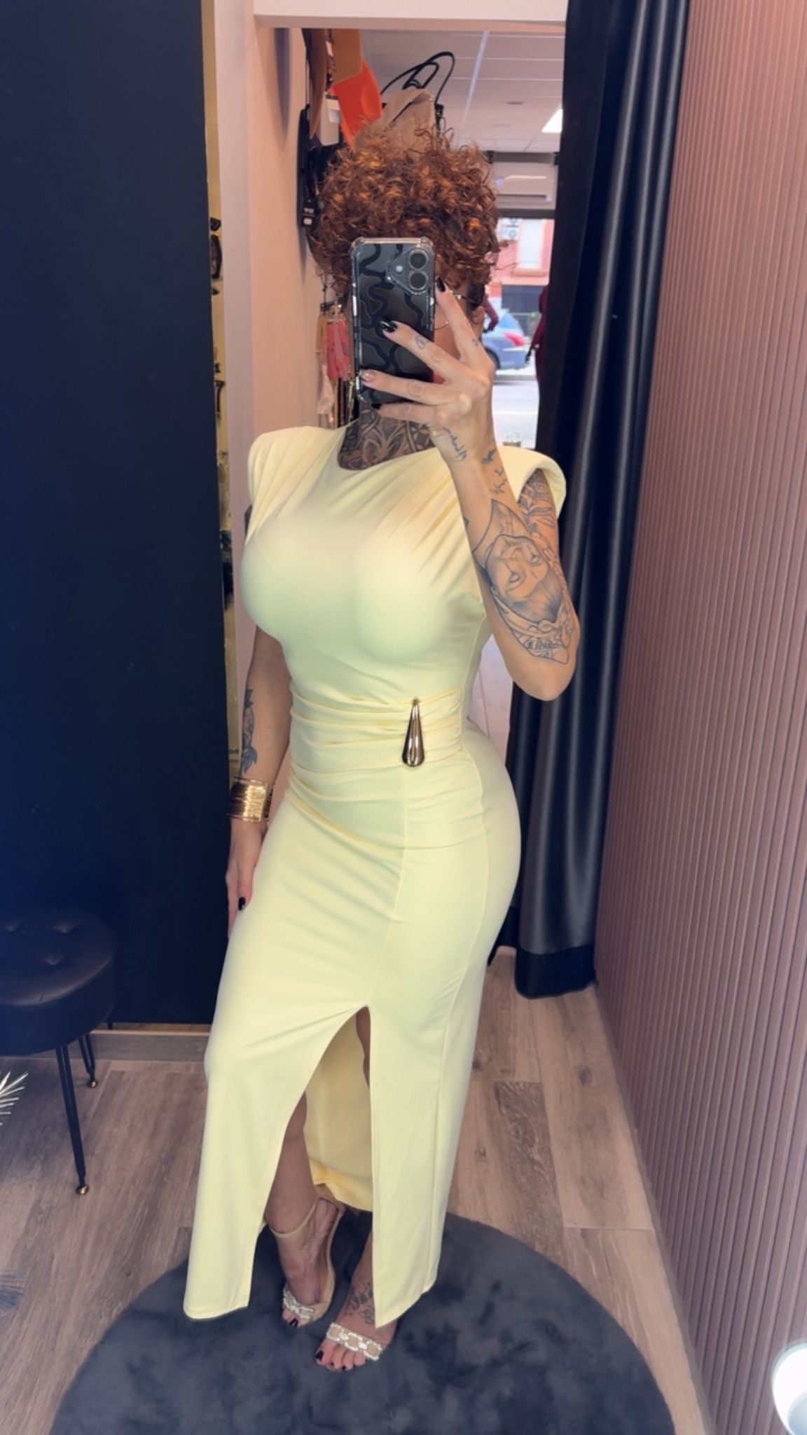 Vestido ajustado de corte midi, diseñado para resaltar la silueta con un estilo sofisticado y femenino. Cuenta con detalles fruncidos, abertura frontal y un elegante accesorio metálico en la cintura que aporta un toque moderno y glamuroso. Perfecto para eventos, cenas o ocasiones especiales. 💫👗