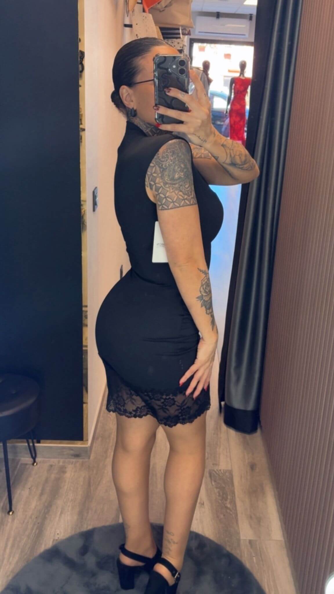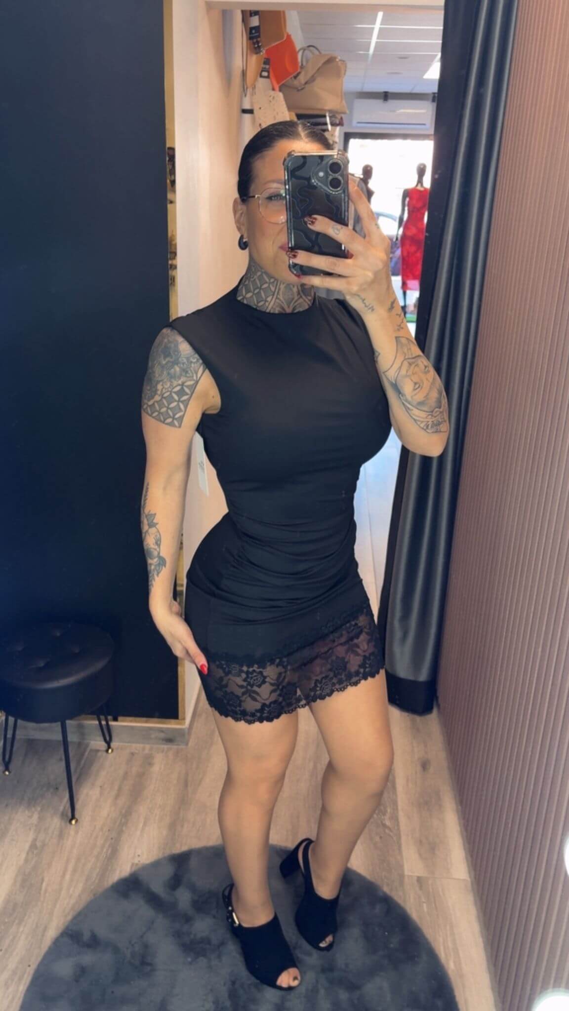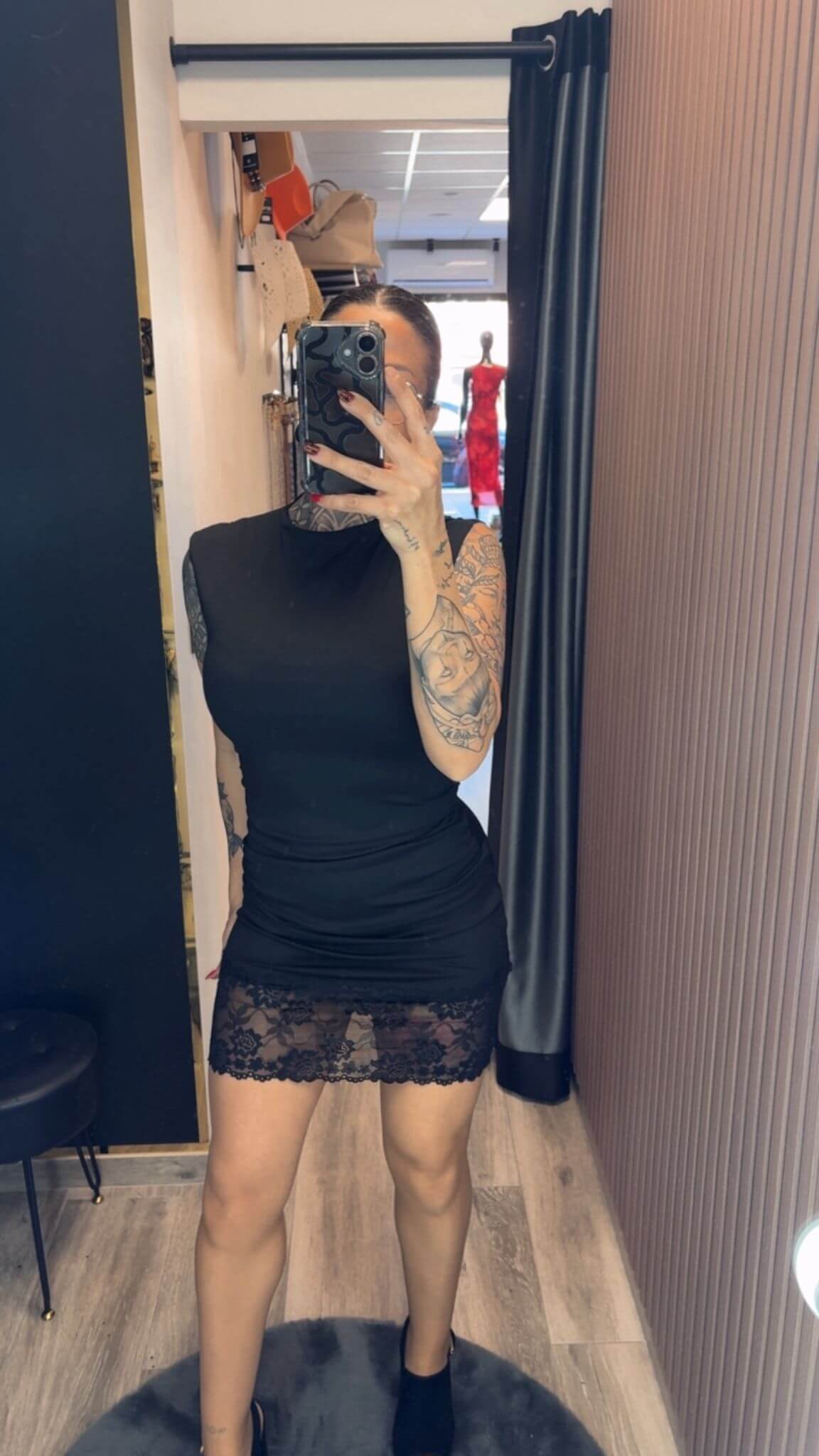 Vestido corto de corte ajustado que realza la silueta con un diseño elegante y muy favorecedor. Su tejido elástico se adapta perfectamente al cuerpo, marcando la figura con comodidad, mientras que el detalle de encaje en el bajo aporta ese toque sofisticado y femenino que eleva el look.